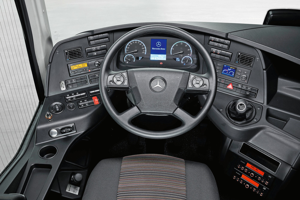 Eine Besonderheit des neuen Tourismo ist die Möglichkeit, zwischen zwei Cockpits zu wählen: Unternehmen können sich zwischen der funktionellen Variante «Cockpit Basic Plus» und der komfortableren Variante «Cockpit Comfort Plus» entscheiden. Die Grundkonstruktion mit Multifunktionslenkrad und der neuen Instrumentenanlage mit farbigem TFT-Display ist identisch. Jedoch unterscheiden sich Form und Funktion. So hebt sich das Cockpit Comfort Plus unter anderem durch das Coach Multimedia System CMS in Doppel-DIN-Ausführung sowie Dekoreinleger ab.
