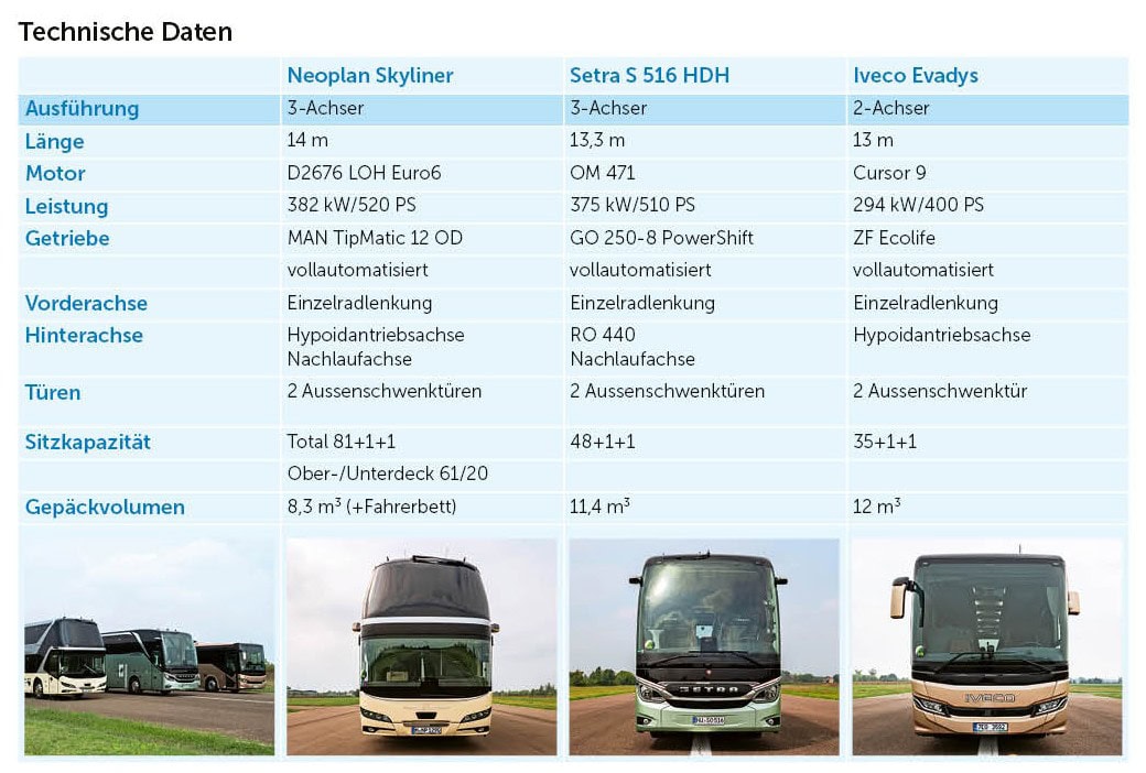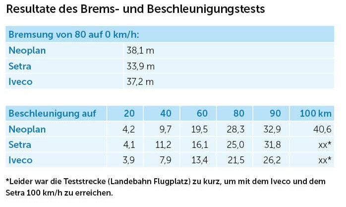 Einzig das Getriebe zeigte sich etwas träge, mit relativ langen Schaltvorgängen. Bei langsamer Geschwindigkeit, z.B. beim Einfahren in einen Kreisverkehr, kommt das Fahrzeug fast zum Stillstand. Dies fällt jedoch im Personentransport weniger ins Gewicht als im Güterverkehr. Dafür überzeugen die zahlreichen Sicherheitssysteme, die bereits heutige Vorschriften übertreffen. Das elegante Äussere und Innere des dreiachsigen Reisebusses lädt zu langen Reisen ein. Klimatisierung und Beleuchtung sind äusserst fahrgastfreundlich. Die kleine Stufe zur hintersten Sitzreihe war etwas zu spärlich beleuchtet. Die grossen Staufächer bieten viel Platz für Gepäck.