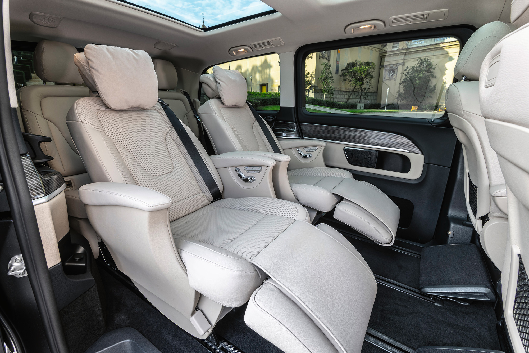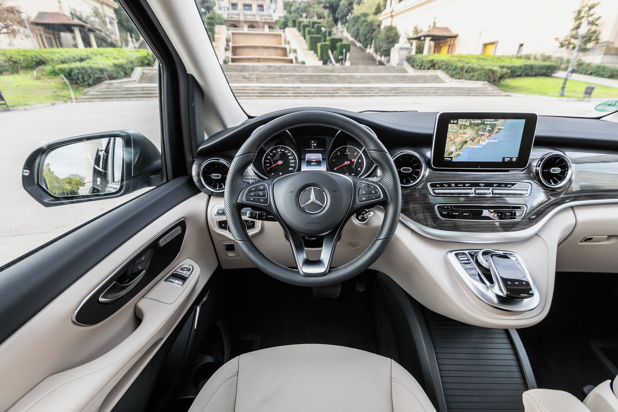 Für den Einsatz als Hotelshuttle ist jetzt auch in Europa eine First-Class-Bestuhlung im Fond erhältlich, die bereits in China angeboten wurde und aus komfortablen Einzelsitzen besteht. Das Cockpit wurde zwar etwas aufgehübscht, die neuen Instrumente à la MBUX oder Bildschirm-Cockpit haben den Weg nicht in die V-Klasse gefunden. Ansonsten hat Mercedes weitere Assistenzsysteme eingeführt und erhöht mit dem neuen Aktivbrems­assistenten und dem erweiterten Fernlichtassistenten die Zahl der Sicherheits- und Assistenzsysteme in der V-Klasse auf dreizehn. Somit erkennt der Wagen, wenn sich Kollisionsgefahr mit ­einem vorausfahrenden Wagen anbahnt. Je nach Reaktion des Fahrers auf die Warnung des Systems wird die Bremsung oder das Ausweichmanöver subtil, aber effizient unterstützt. Der erweiterte Fernlichtassistent wiederum ist ein Matrix-­LED-Licht, das dauernd aufblendet, aber mittels einer Licht­aussparung entgegenkommende oder vorausfahrende Fahr­zeuge «entblendet».