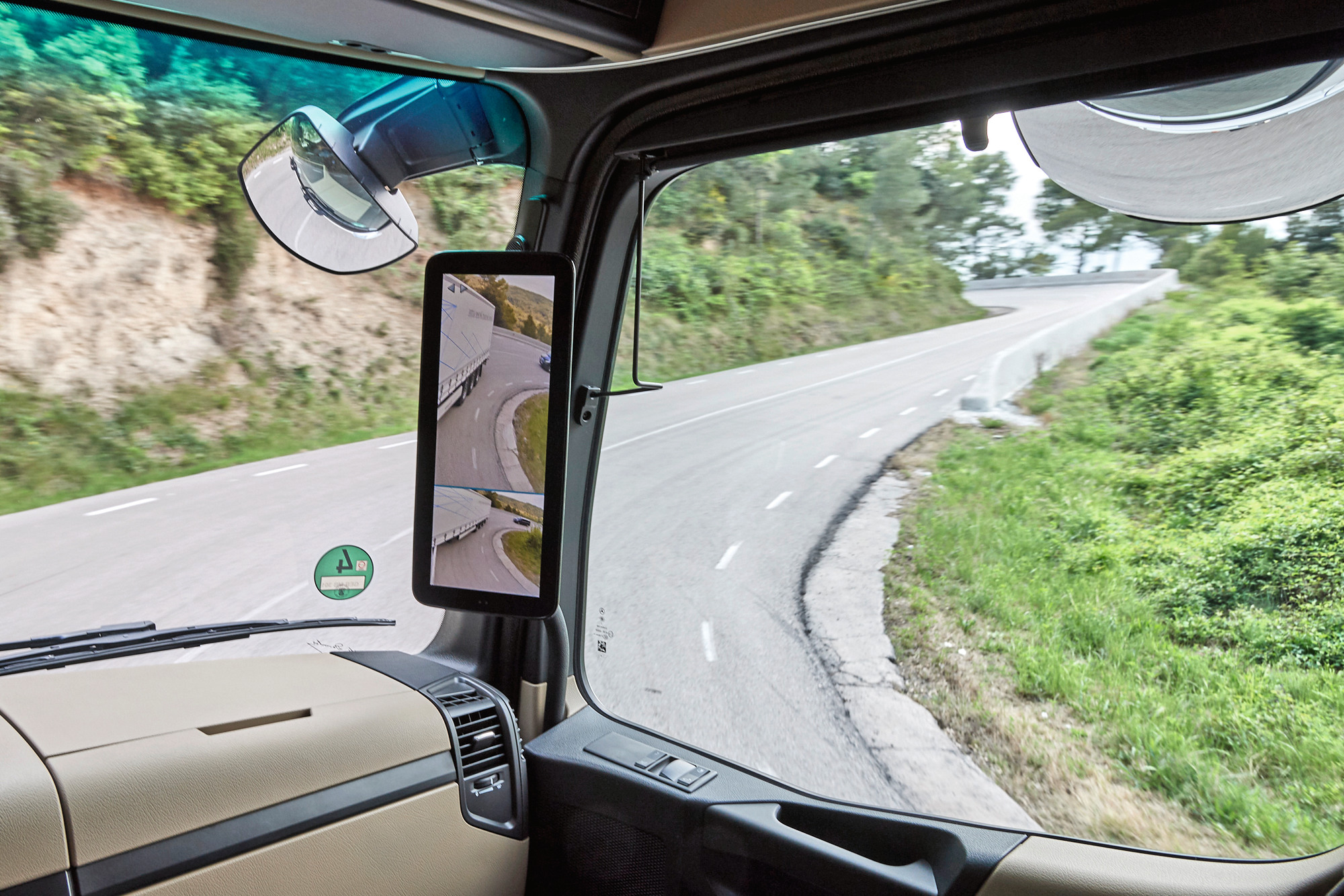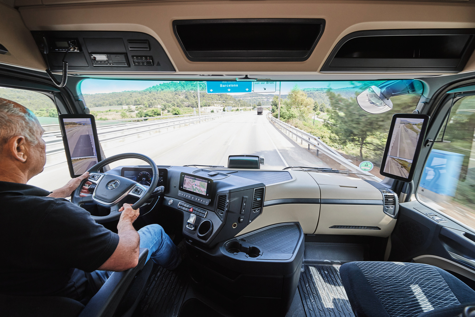Beim Actros verabschiedet sich Mercedes vom herkömmlichen Aussenspiegel und ersetzt ihn beidseitig durch je eine Kamera und einen hoch gestellten Bildschirm innen an der A-Säule. Wir haben uns sofort an diese Neuerung gewöhnt, zumal das Bild gestochen scharf ist und die gleichen Sichtfelder wie herkömmliche Spiegel dargestellt werden. Die Kameras befinden sich so hoch, dass sie ausserhalb des Spritzwasserbereichs sind und daher praktisch nicht mehr verschmutzt werden. Somit werden selbst bei widrigem Wetter optimale Sichtverhältnisse geboten, was direkt der Sicherheit des Fahrzeugs und der Fahrzeugumgebung zugute kommt.