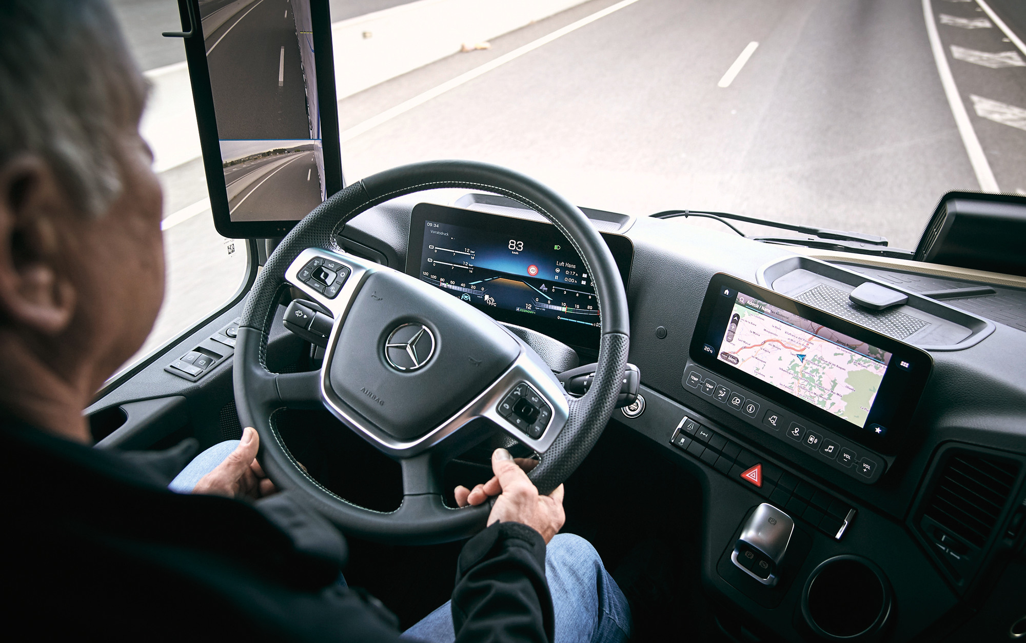Beide Screens werden von Bedientasten im Lenkrad gesteuert, wobei der rechte Bildschirm auch ein Touchscreen ist, der sich aber nur im Stillstand sicher bedienen lässt. Übrigens lassen sich praktisch alle individualisierten Zusatzfunktionen, die es in einem Lastwagen geben kann, in die neue Bedienstruktur integrieren, was dem Wildwuchs in der Kabine ein Ende setzt. Zudem lassen sich ausgewählte Apps des App-Portals von Mercedes Trucks per Touchscreen bedienen.