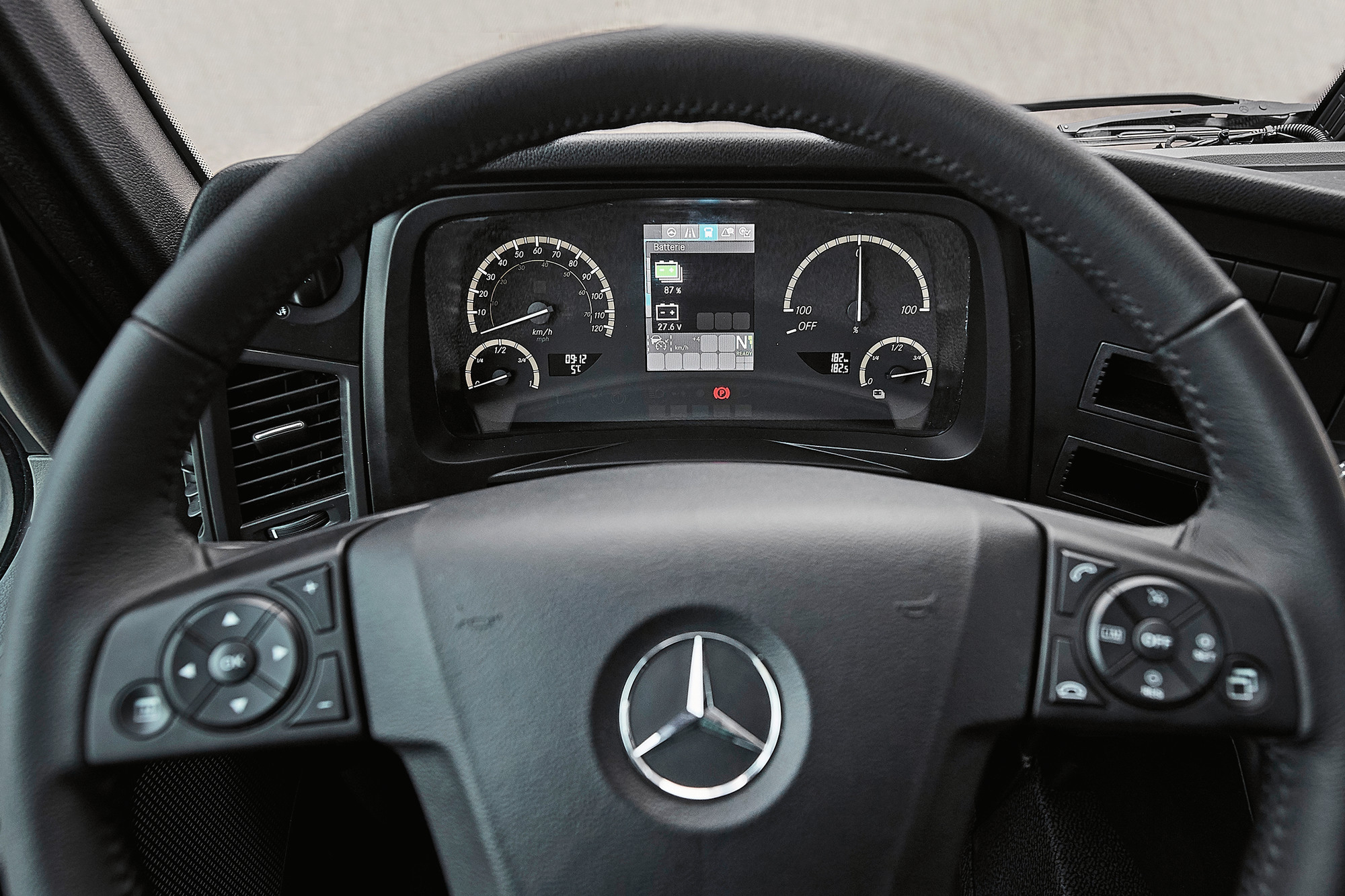 Für den Chauffeur hält das Fahrerhaus wenig Überraschendes bereit. Die Anordnung der Anzeigen, Schalter und Peripheriefunktionen sind praktisch mit dem normalen Actros identisch. Das Hauptinstrument ist jedoch auf den Elektroantrieb abgestimmt. So verfügt es statt des Drehzahlmessers über eine Energieanzeige, welche die Energieabgabe und -rückgewinnung anzeigt. Statt einer Tankanzeige wurde die Ladestandsanzeige eingefügt und das Multifunktionsdisplay wurde um Aspekte wie die Restreichweite ergänzt. In diese Veränderungen fliessen teilweise auch die Informationen der eingangs erwähnten umfangreichen Zusatzsensorik ein.