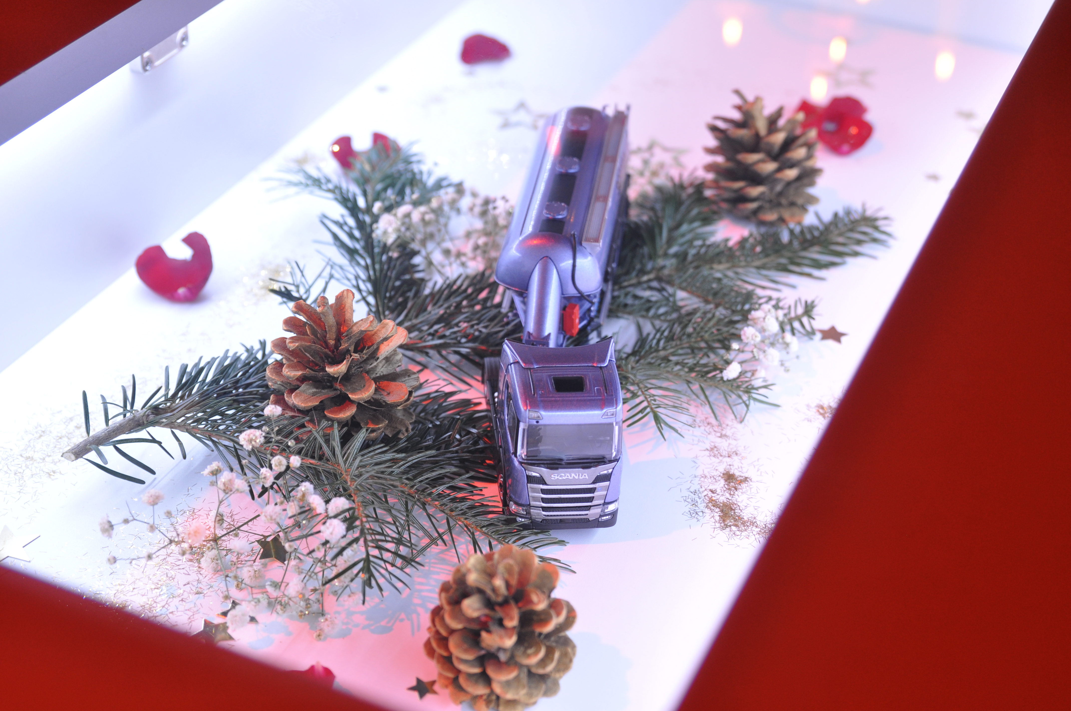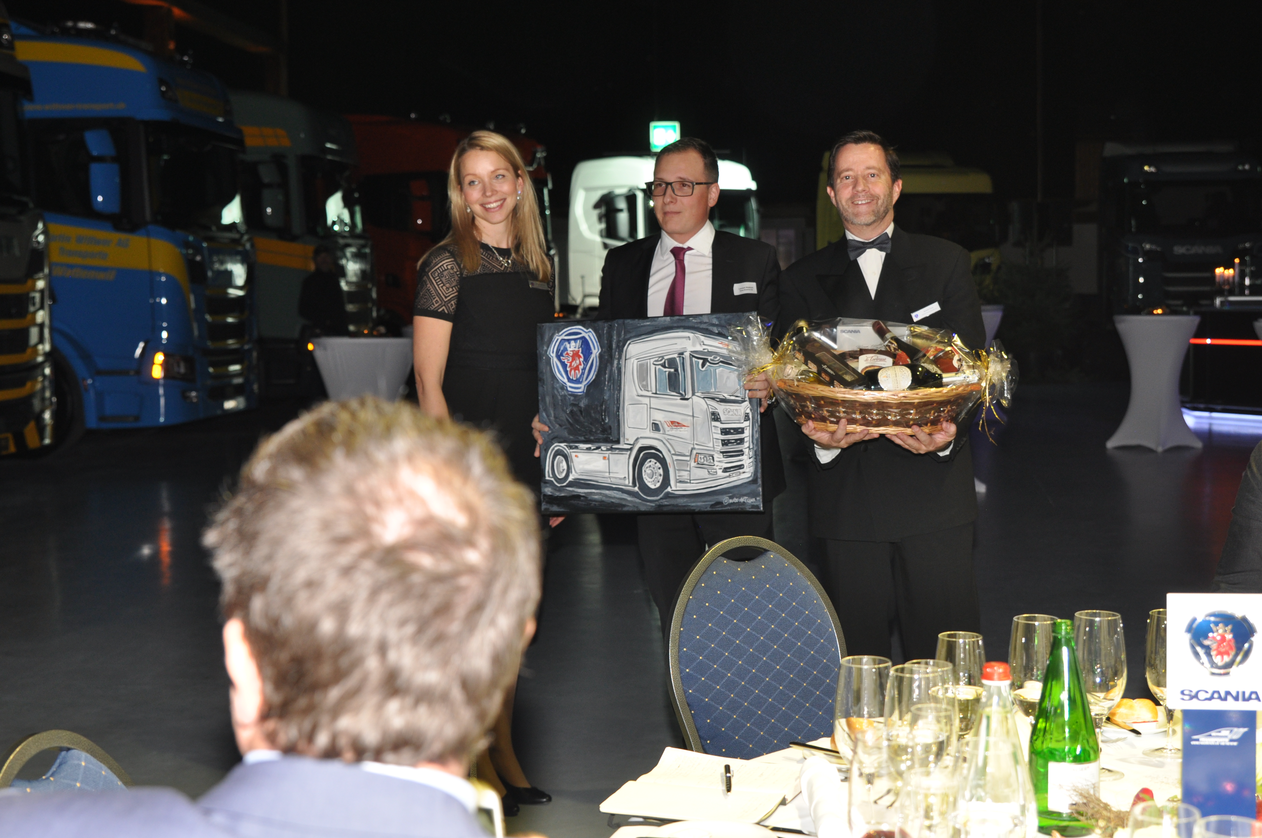 Dass die ersten Kundenauslieferungen in die Weihnachtszeit fallen, hat Scania Schweiz als einziger Markt in ganz Europa zu einer besonderen Aktion für die Fahrzeugübergabe genutzt. Die 26 Kunden wurden nach Bern eingeladen, wo jedem einzelnen in festlichem Rahmen und vor rund 200 Gästen ihr blind bestelltes Fahrzeug übergeben wurde. Als besondere Beigabe überreichten Gerhard Waser und seine Mitarbeiter ein eigens für jeden Lastwagen angefertigtes Gemälde der deutschen Künstlerin Nina K. Matthies. «Die Schweiz hat die anspruchsvollsten Kunden», verriet der frühere Scania-Schweiz-Chef (2005 bis 2006) Christian Levin, «hat aber auch die grössten Fans der Marke.» So hätten die Schweizer europaweit prozentual den grössten Anteil an Scania Next Generation bestellt. Ein kurzes Video zu jedem Kunden, von Monika Erb (Moderatorin, Model) gekonnt und charmant geführte Übergaben und diverse Show-Acts sorgten für die zum Event passende feierliche, vorweihnachtliche Stimmung. Und so war nicht Södertälje, sondern Bern für einen Abend lang die eigentliche Scania-Hauptstadt.