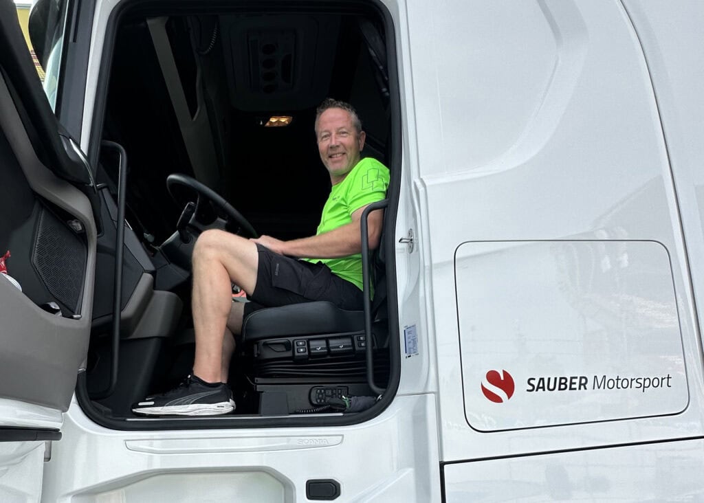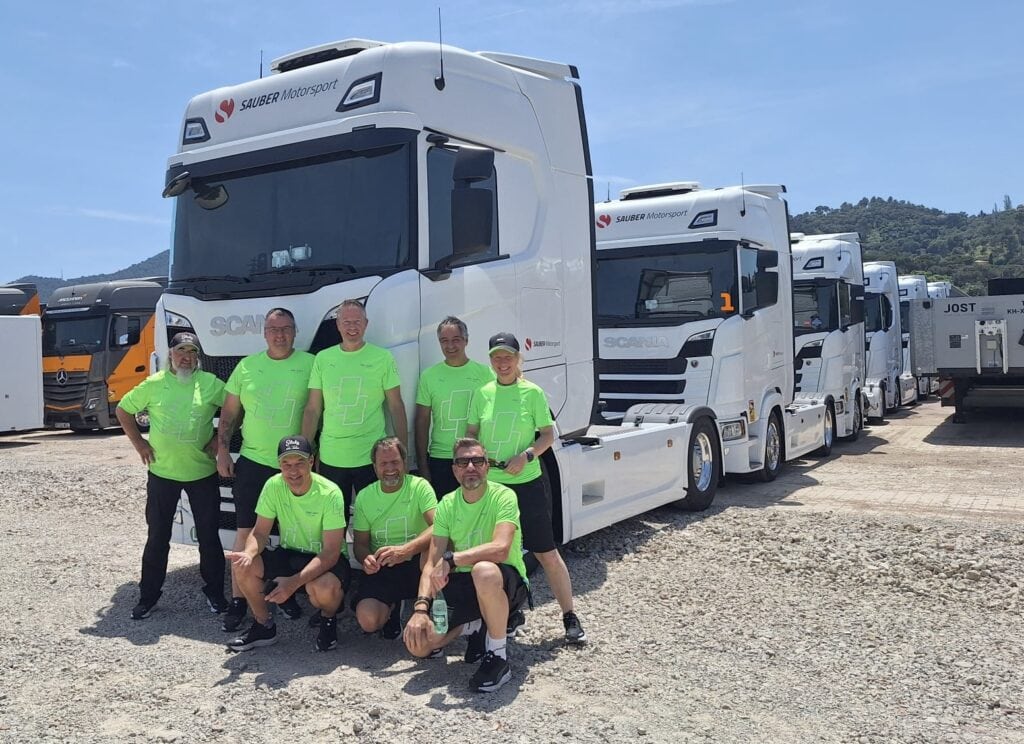 Für die neun Europa-Rennen steht in Hinwil ein Team von 20 Lastwagenfahrern/-innen bereit, um die vier Scania-Sattelzugmaschinen an den nächsten Einsatzort fahren zu können. Reto Casty, selbst schon seit 24 Jahren für Sauber unterwegs, ist dabei für das Fahrerteam verantwortlich. Er plant und koordiniert alle Einsätze für das komplette Fahrerteam.