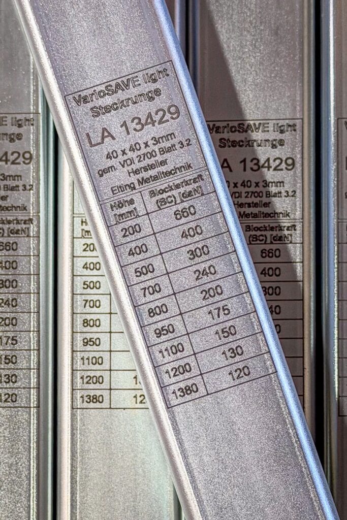 Um die Vorgaben normkonform zu erfüllen, gleichzeitig auch, wie in der Richtlinie gefordert, eine komfortable und dauerhaft gut lesbare Lösung für den Anwender zu bieten und die Kennzeichnung vor Witterung und Beschädigungen zu schützen, hat Elting sich für eine besonders robuste Umsetzung entschieden: «Wir versehen all unsere verzinkten Steckrungen an mehreren Positionen mit einer nahezu unzerstörbaren Lasergravur. Das bedeutet für den Anwender: vollständige Rückverfolgbarkeit über die Chargenverwaltung, eindeutige Herstellerkennzeichnung sowie die klar ausgewiesenen Blockierkräfte in den jeweils relevanten Angriffshöhen – alles dauerhaft sichtbar und benutzerfreundlich angebracht.»